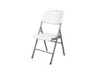 Skládací eventový (bistro) stolek o průměru 80 cm a výšky 110 cm. Deska z odolného bílého plastu na kovové konstrukci. Určeno pro venkovní i vnitřní použití.