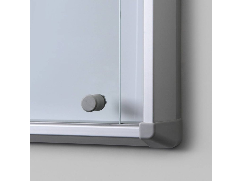 Interiérová vitrína s posuvnými dveřmi s protipožární certifikací, velikosti 15xA4, se stříbrným rámem. Popisovatelná a magnetická kvalitní lakovaná kovová záda pro uchycení Vašeho informačního materiálu. Vnitřní hloubka činí 30 mm. Díky oblým rohům a tvrzeným skleněným dveřím je vitrína maximálně bezpečná. Vitrína je osazena cylindrickým zámkem. Ideální pro použití v koridorech, chodbách a požárních evakuačních cestách.