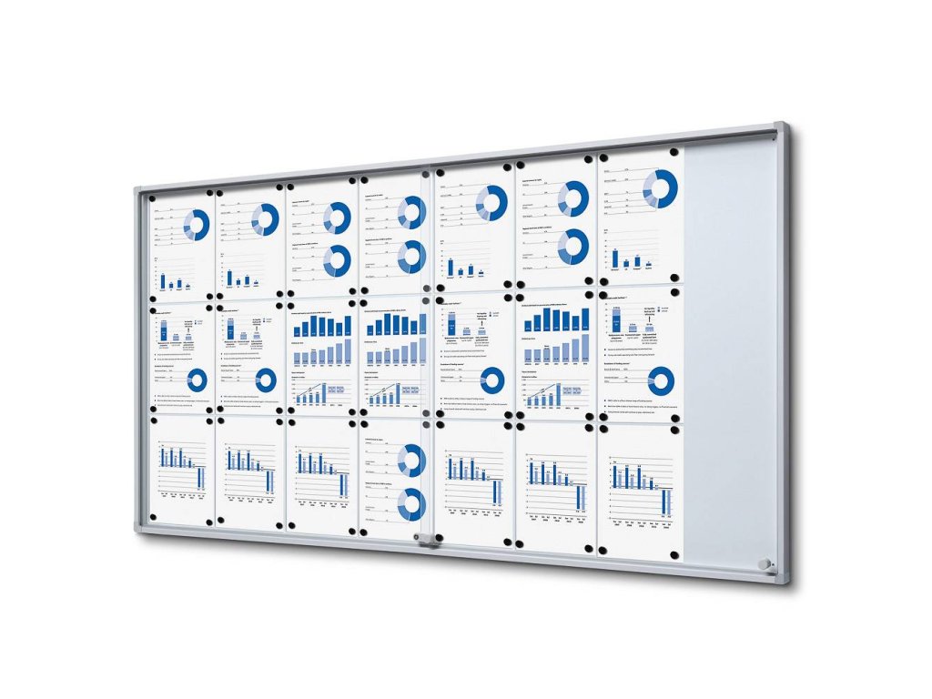 Interiérová vitrína 24xA4 SLIM, posuvné dveře, plechová záda, ochranné rohy