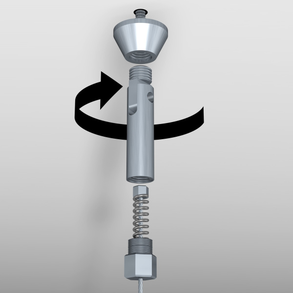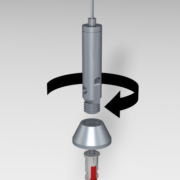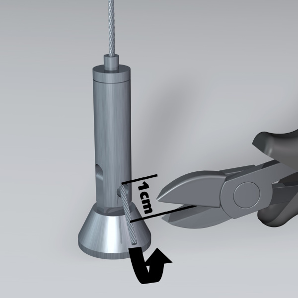 Vypínací prvky zajišťují pevné a bezpečné uchycení lankového systému a instalují se jednoduše pomocí šroubu a hmoždinky. Součástí sestavy je kovový vypínací prvek s kyvnou hlavou, který umožňuje flexibilní montáž i v prostorách s atypickým řešením stropu nebo stěn. Díky této konstrukci lze lankový systém instalovat na různé povrchy dle konkrétních možností provozovny, aniž by byla omezena stabilita nebo vzhled celé prezentace.