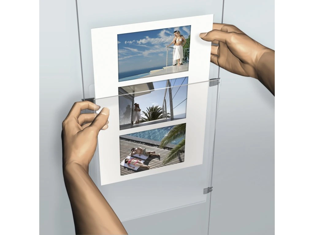 Tato lanková sestava do výlohy představuje praktické a elegantní řešení pro přehlednou prezentaci nabídek přímo z ulice. Konfigurace s pěti svislými sloupci po čtyřech plastových kapsách A4 na výšku je ideální volbou pro menší výlohy. Fixně daná šířka sestavy (propojené sloupce se společnými středovými lankovými sety).