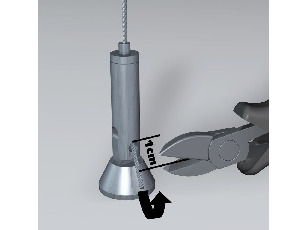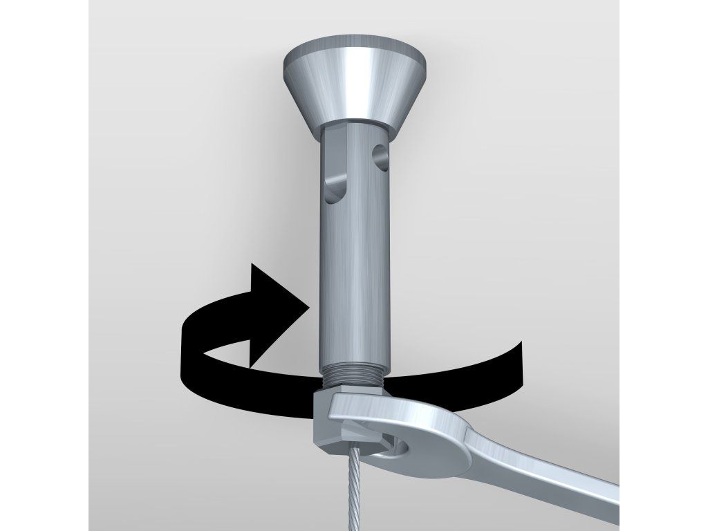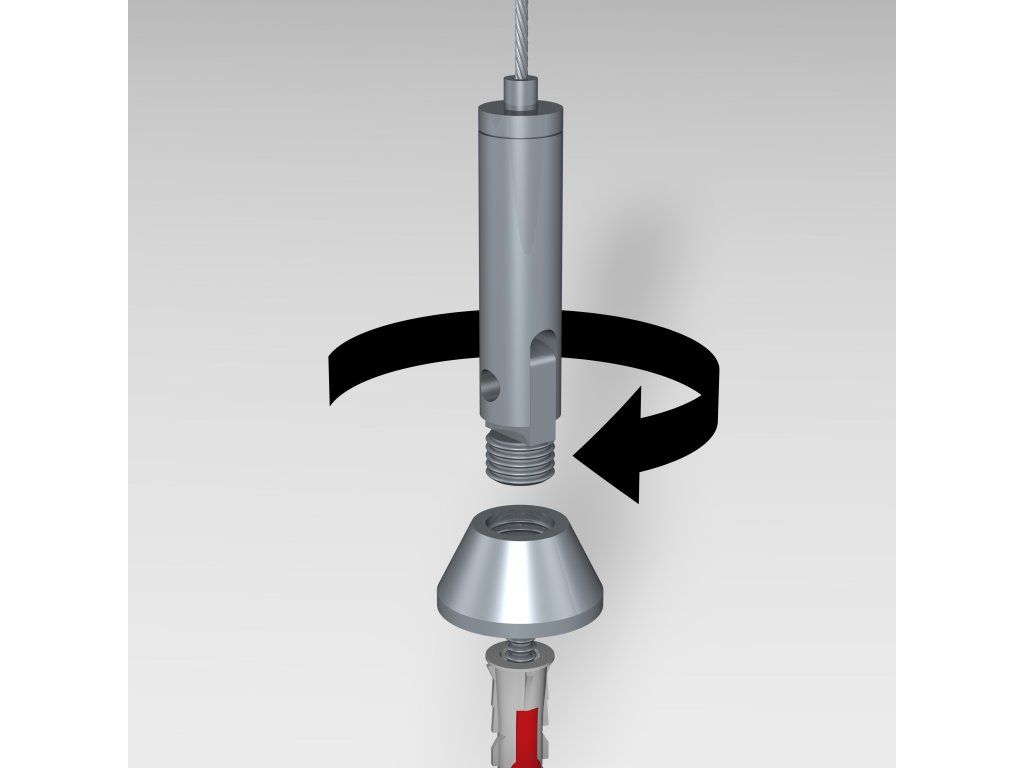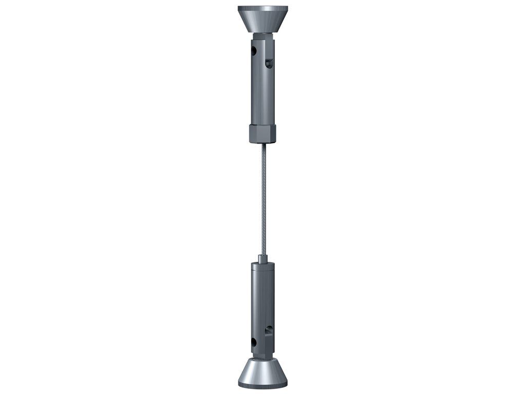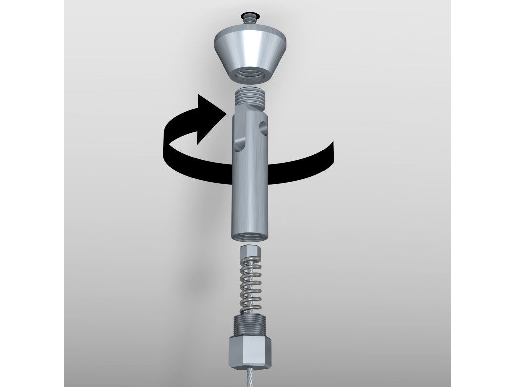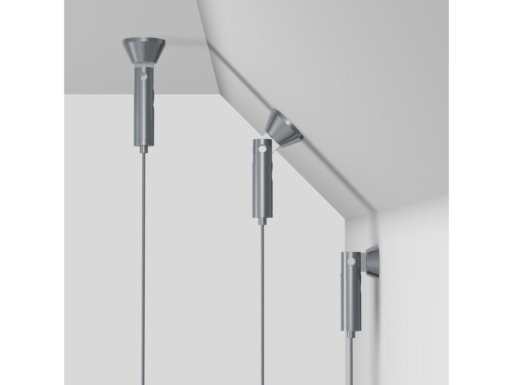 Vypínací prvky zajišťují pevné a bezpečné uchycení lankového systému a instalují se jednoduše pomocí šroubu a hmoždinky. Součástí sestavy je kovový vypínací prvek s kyvnou hlavou, který umožňuje flexibilní montáž i v prostorách s atypickým řešením stropu nebo stěn. Díky této konstrukci lze lankový systém instalovat na různé povrchy dle konkrétních možností provozovny, aniž by byla omezena stabilita nebo vzhled celé prezentace.