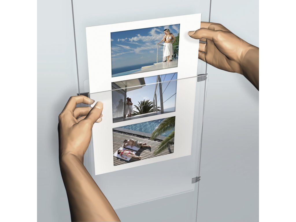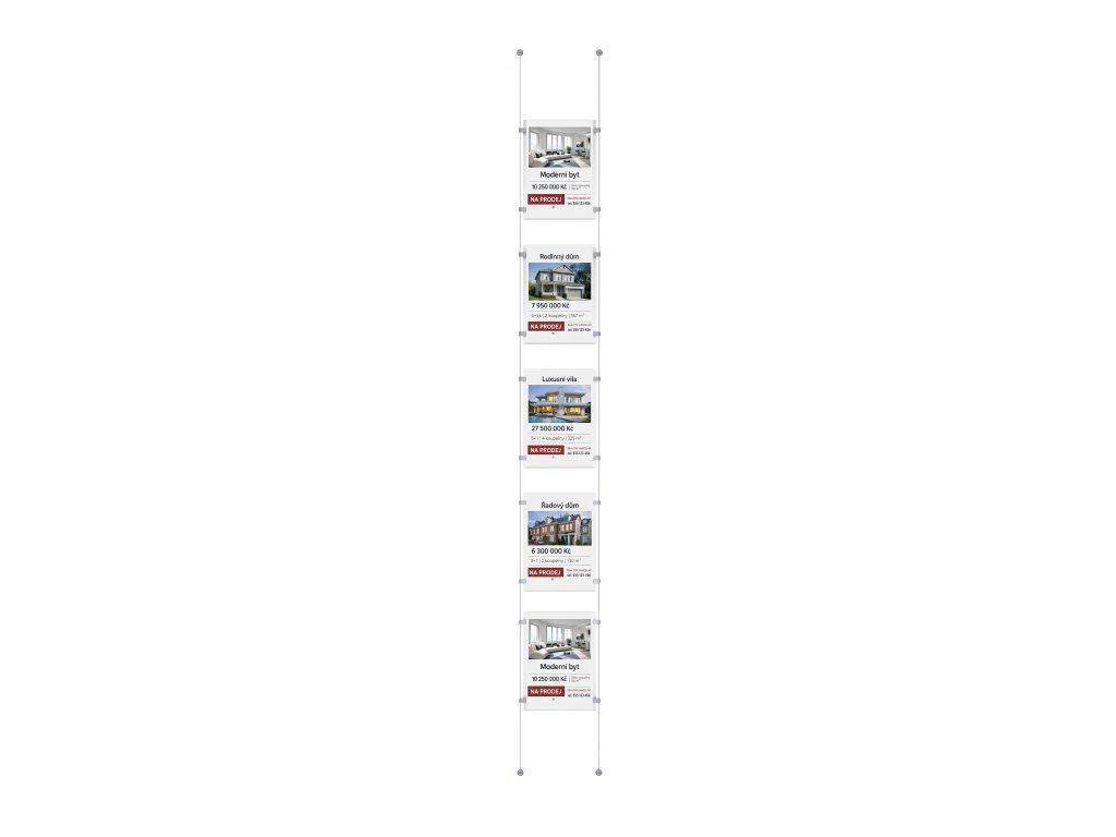 Lankový systém do výlohy 5× A4 bez osvětlení pro přehlednou prezentaci nabídek, inzerátů a reklam ve výloze. Sestava s 5 kapsami A4 v jednom svislém sloupci je ideální pro realitní a cestovní kanceláře i pro firemní prezentaci.