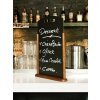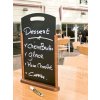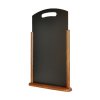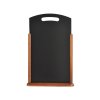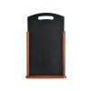 Menu stojánek s oboustranně popisovatelnou deskou. Masivní dřevěná základna opatřená tmavě hnědým lakem. Využití pro prezentaci denní nabídky v barech, restauracích nebo hotelech. Plocha stojánku je v horní části prodloužena a opatřena rukojetí.