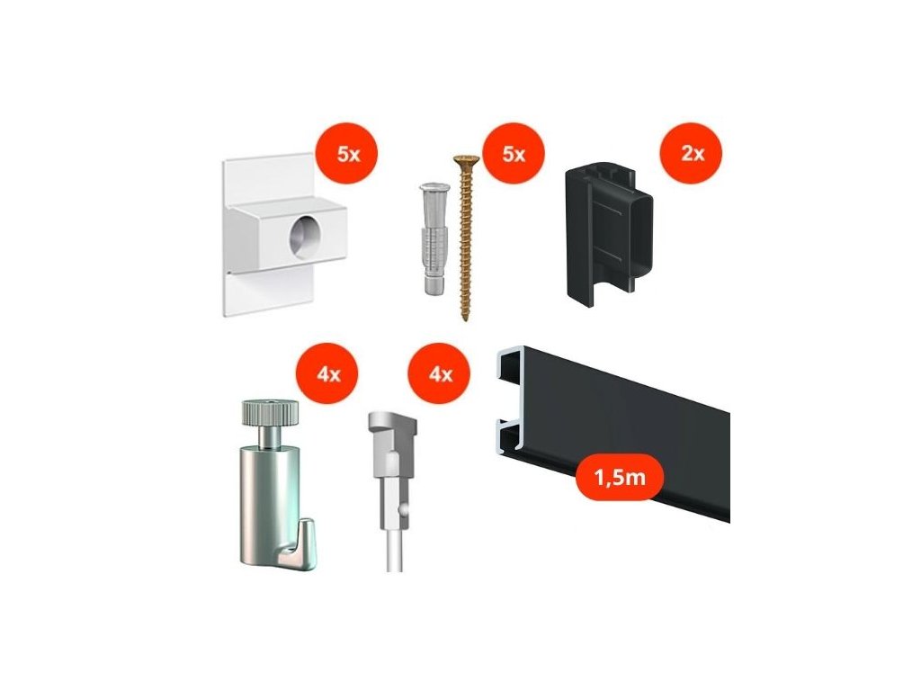 Set nástěnné lišty pro zavěšení obrazů. Součástí setu je černá lišta o délce 1,5m, příchytky, koncovky a perlonová lanka se špičkovými samosvornými háčky.