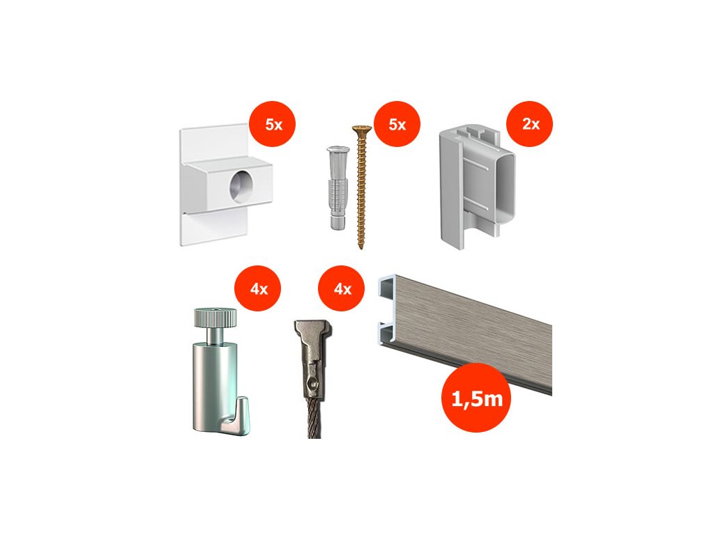 Set nástěnné lišty pro zavěšení obrazů. Součástí setu je eloxovaná lišta o délce 1,5m, příchytky, koncovky a ocelová lanka se špičkovými samosvornými háčky.