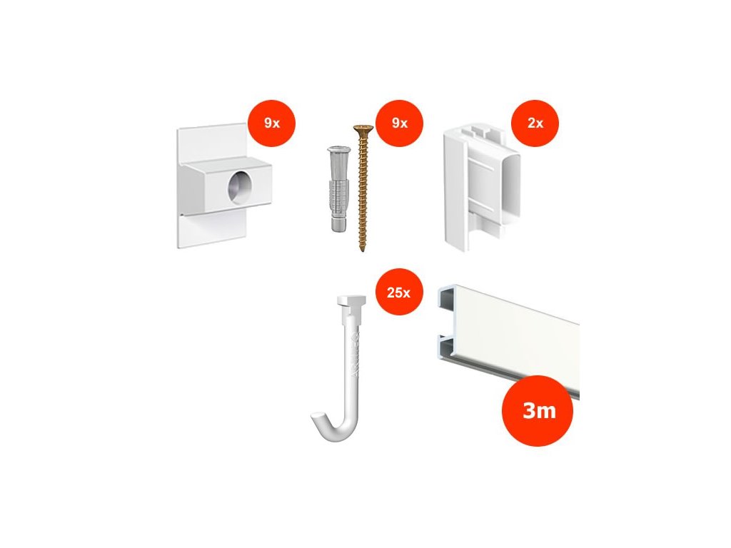 Set nástěnné lišty pro zavěšení obrazů. Součástí setu je bílá lišta o délce 3m, příchytky, koncovky a 25ks jednoduchých háčků Twister Hook.