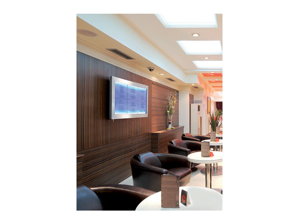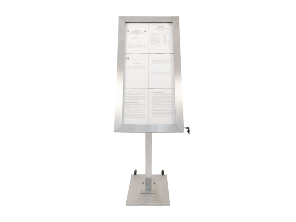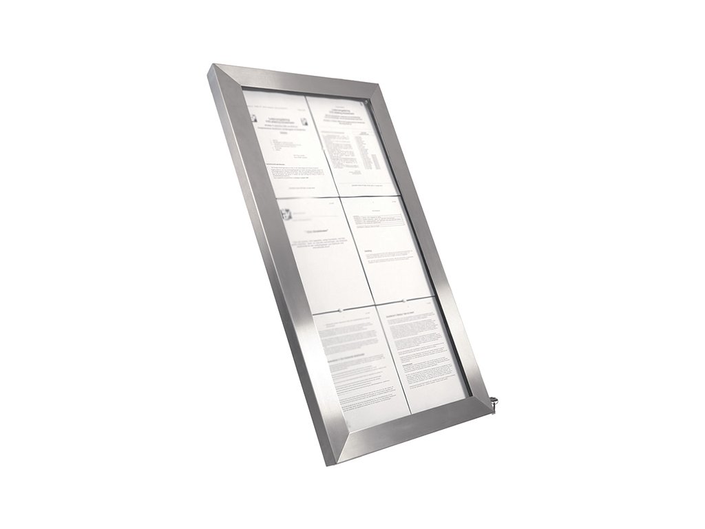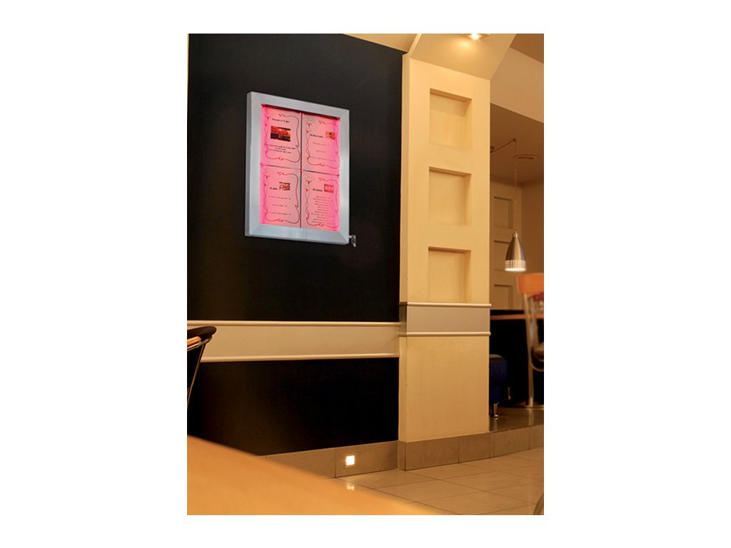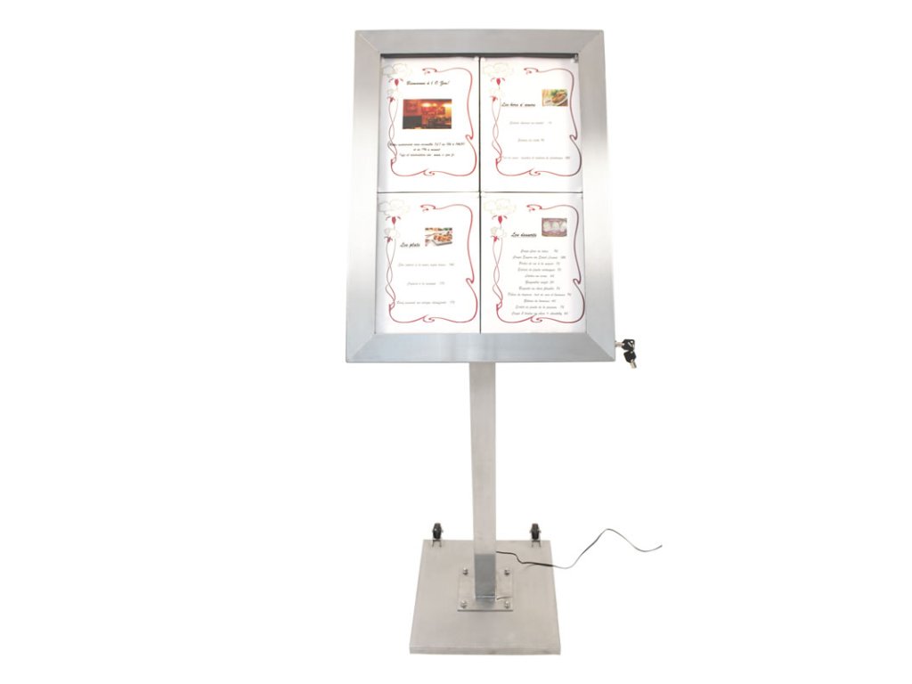 Vitrína pro čtyři A4 s nerezovou ocelovou konstrukcí. Podsvíceno 48 ks LED diodami (programovatelné režimy podsvícení). Jednoduchá výměna motivu. Odolné vůči vlivům počasí. Určeno pro montáž na stěnu nebo osazení na nerezový masivní podstavec.