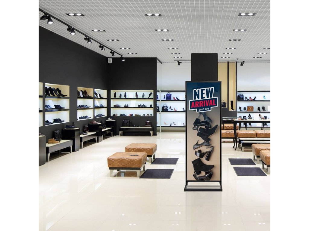 Plakátový stojan Decor s klaprámem byl navržen pro oboustrannou reklamu. Umožňuje vám vyvěsit 2 plakáty, jeden na každou stranu. Pozvedněte svou reklamu a nechte ji zářit ze 2 stran.
