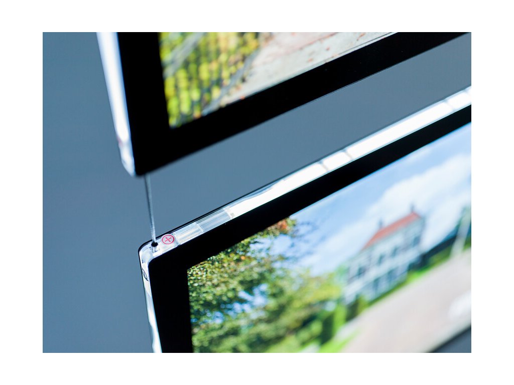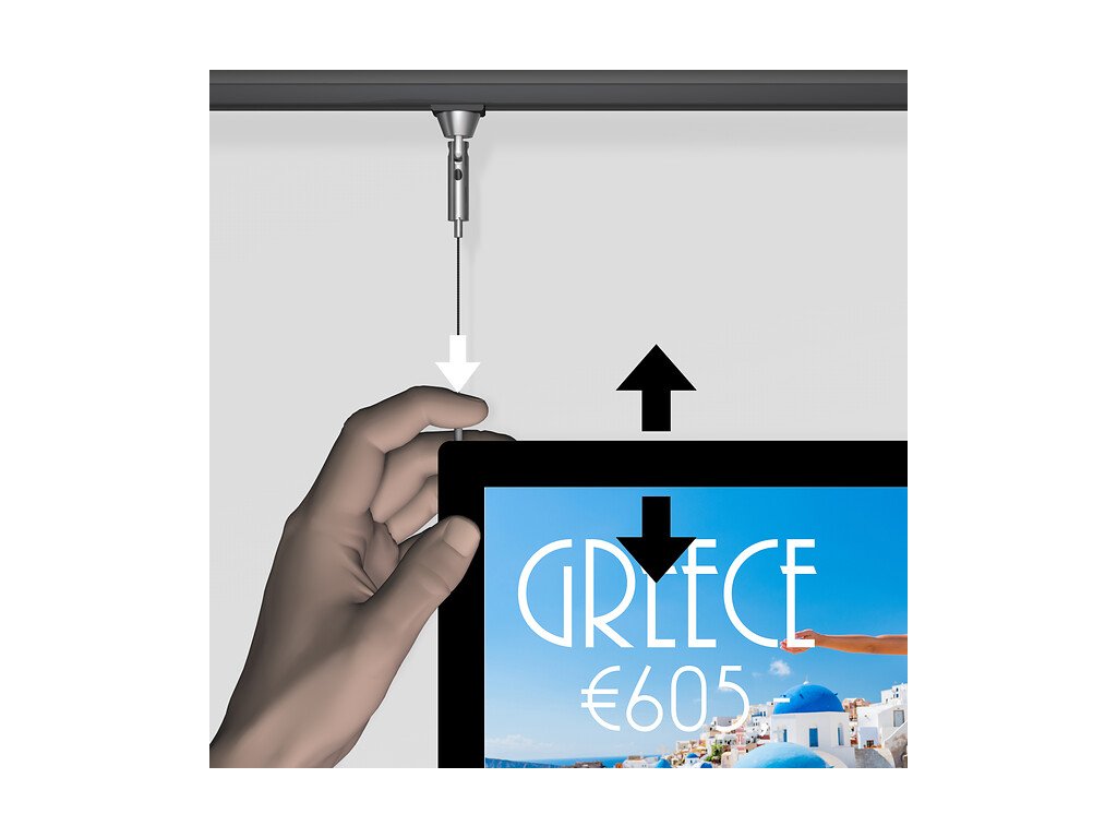 Oboustranný LED panel formátu A4 s černým rámečkem. Plastové magnetické kapsy s možností jednoduchého umístění či výměny obrázku nebo nabídky. Příkon 9W. Snadné polohování kapsy na napájecích lankách systém Display It.