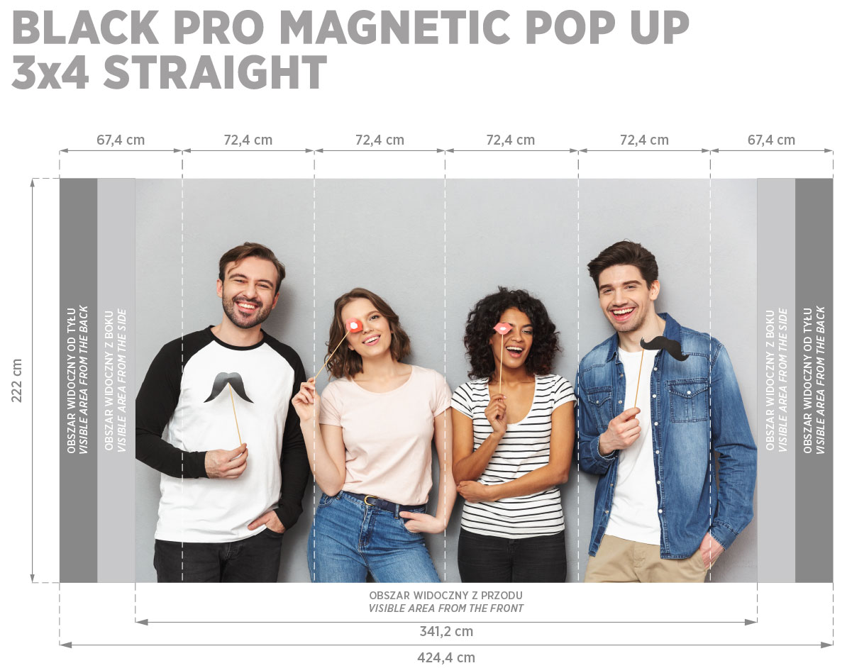 Exkluzivní rovná reklamní stěna Pop Up Magnetic Premium Black 3x4 s hliníkovou skládací konstrukcí včetně mobilního pultíku na kolečkách. Prémiová stěna s konstrukcí v černé barvě. PVC panely s grafikou jsou připevněné pomocí magnetické pásky.