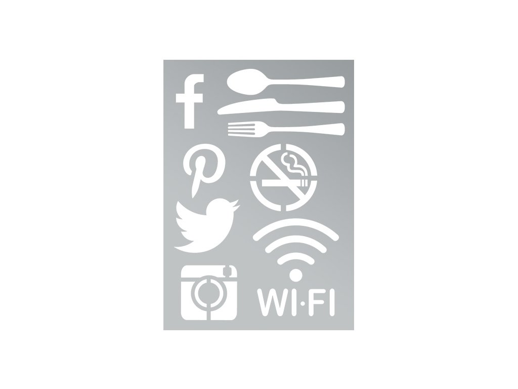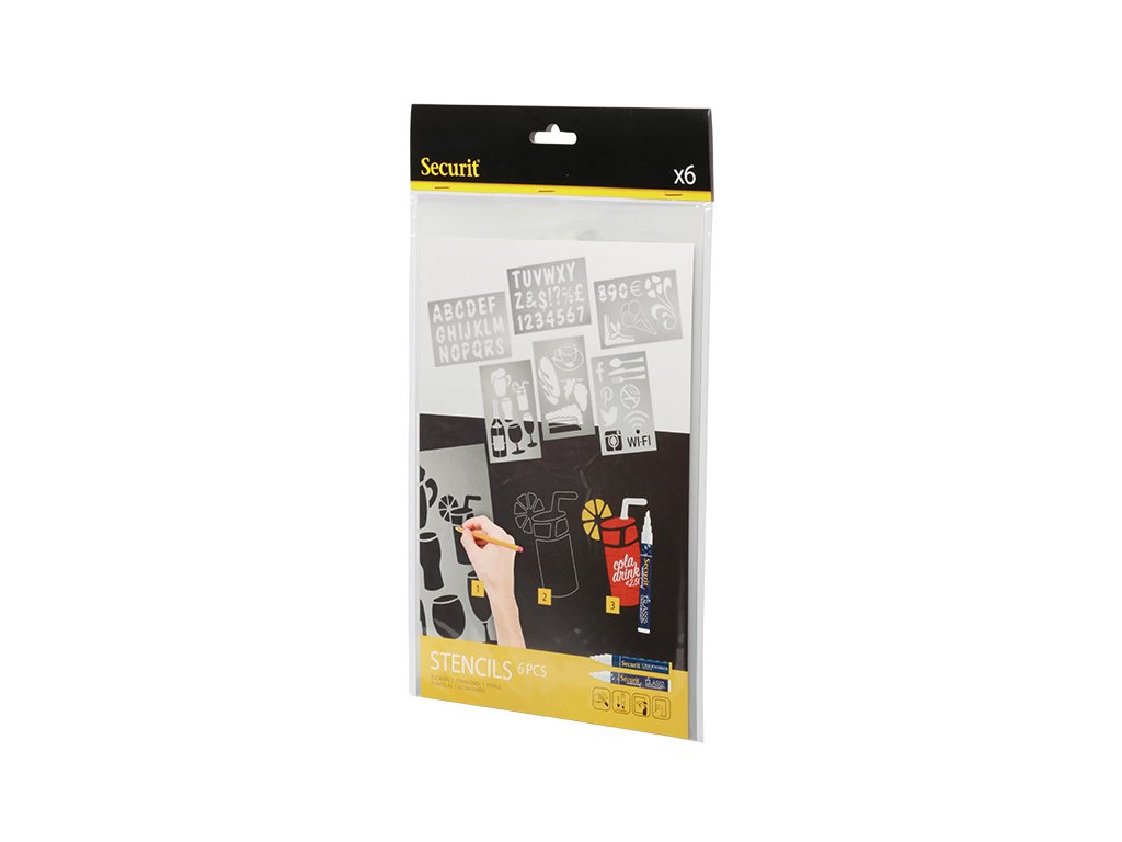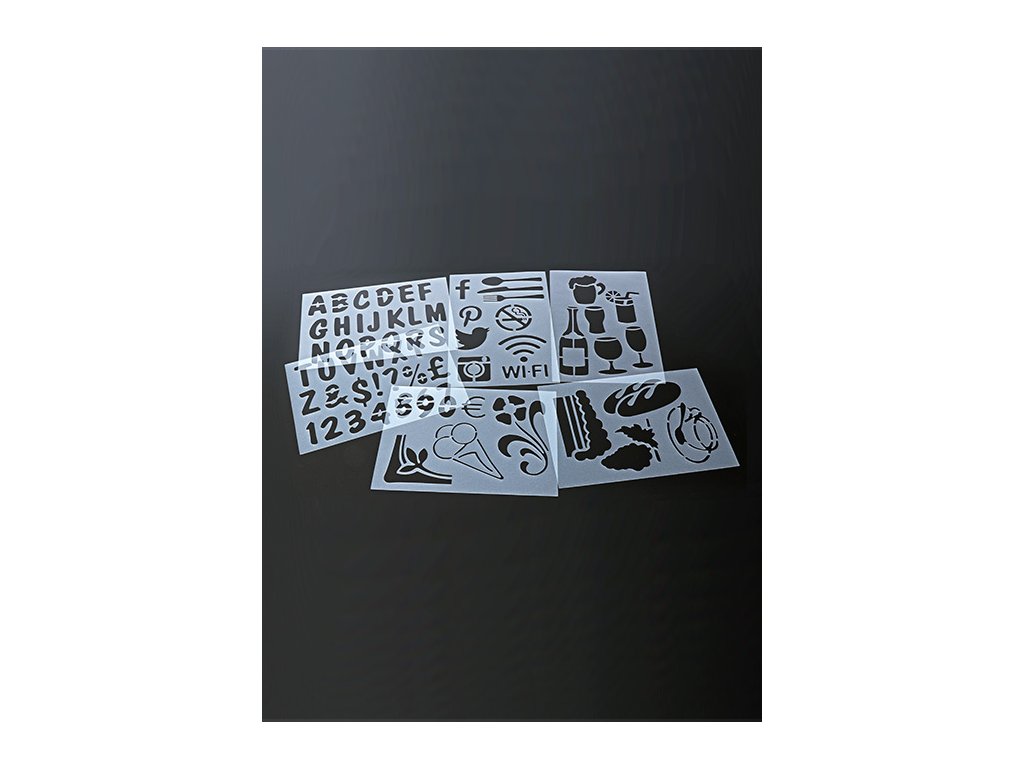 Sada 6 speciálních šablon pro popisování tekutými křídovými popisovači. Vytvořte poutavé a nepřehlédnutelné nápisy s vaší nabídkou. V sadě je k dispozici celá abeceda a číslice s designovým písmem a řada tématických piktogramů.