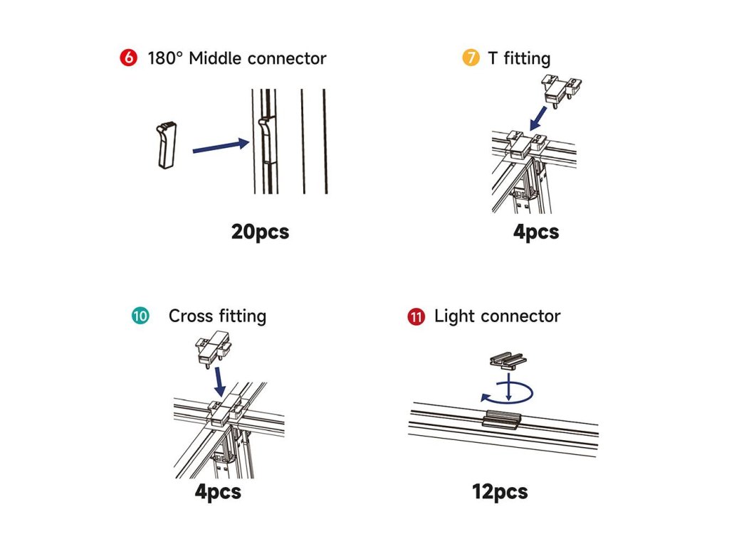 Konektory jsou vyrobeny z odolného ABS plastu, který zajišťuje pevné, stabilní a dlouhodobé spojení bez vůlí. Jednoduše je zasunete do příslušné pozice v rámu a můžete začít vytvářet větší stěny, rohová spojení, stropy atd.