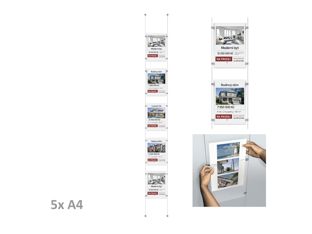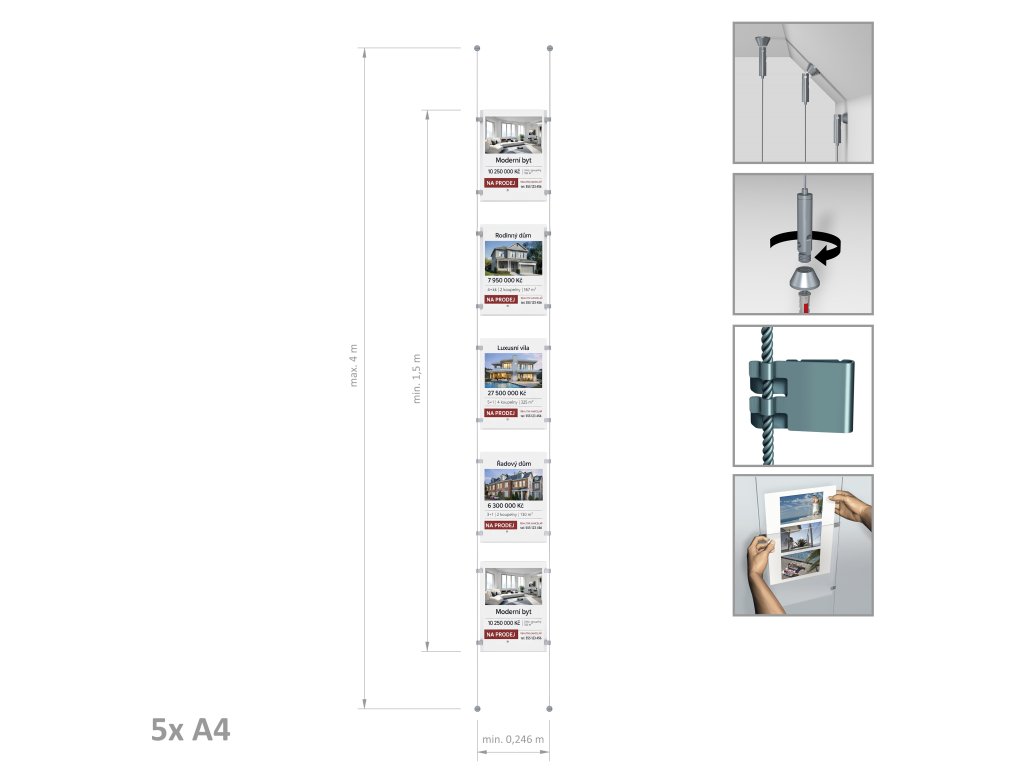 Perfektní řešení vaší multifunkční prezentace - to je lankový systém s 5 kapsami. Balení obsahuje 2 ocelová lanka o délce 4 metry, 20 patentovaných klipů pro uchycení 5 akrylových kapes formátu A4. Lankový systém je kvalitě zpracovaný a výměna plakátů je snadná. Tenká lanka a stříbrné klipy podtrhují celý vzhled vaší prezentace.