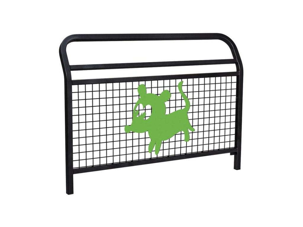 Zábradlí Conviviale s mříží v černé barvě RAL 9005, o délce 1 500 mm, s motivem psa v zelené barvě je odolné, pevné a snadno udržovatelné řešení pro veřejné prostory. Díky dětskému motivu je ideální pro školky, školy a dětská hřiště, kde spojuje spolehlivou ochranu, dlouhou životnost a hravý vzhled, který zpříjemní okolní prostředí.