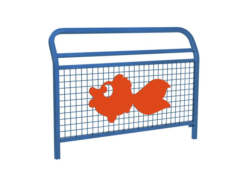Zábradlí Conviviale s mříží v modré barvě RAL 5010, o délce 1 500 mm, s motivem ryby v červené barvě je odolné, pevné a snadno udržovatelné řešení pro veřejné prostory. Díky dětskému motivu je ideální pro školky, školy a dětská hřiště, kde spojuje spolehlivou ochranu, dlouhou životnost a hravý vzhled, který zpříjemní okolní prostředí.