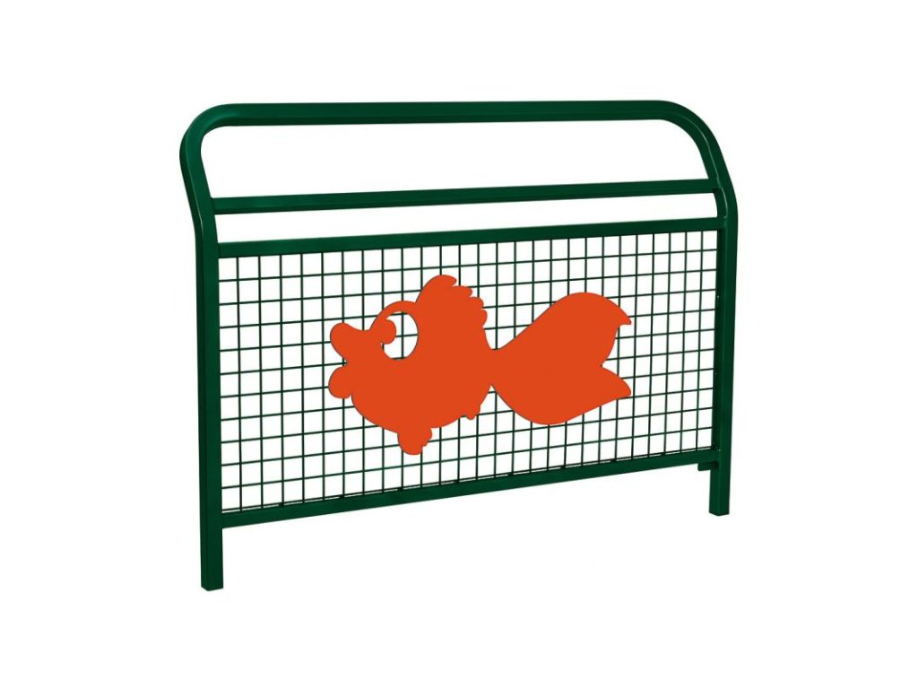 Zábradlí Conviviale s mříží v zelené barvě RAL 6005, o délce 1 500 mm, s motivem ryby v červené barvě je odolné, pevné a snadno udržovatelné řešení pro veřejné prostory. Díky dětskému motivu je ideální pro školky, školy a dětská hřiště, kde spojuje spolehlivou ochranu, dlouhou životnost a hravý vzhled, který zpříjemní okolní prostředí.