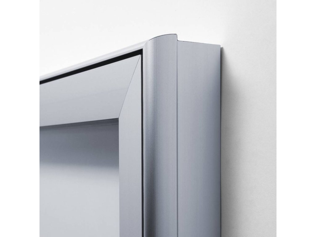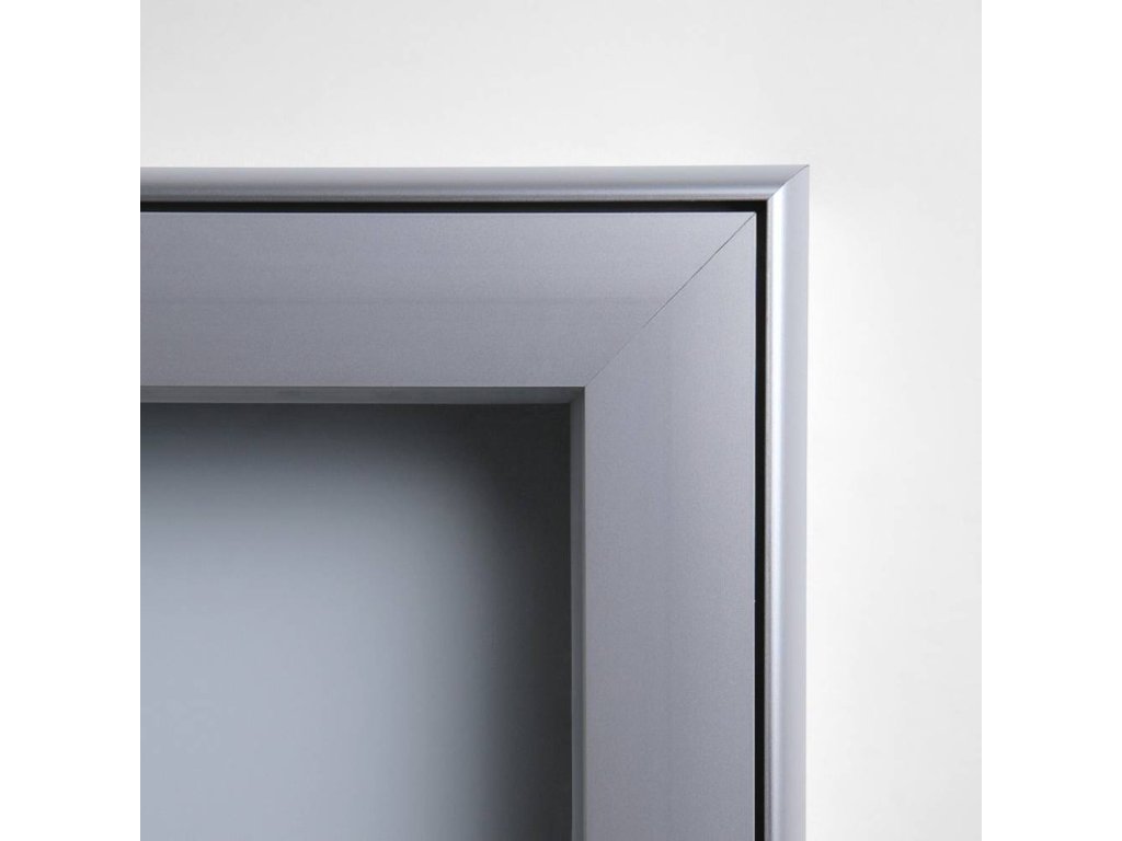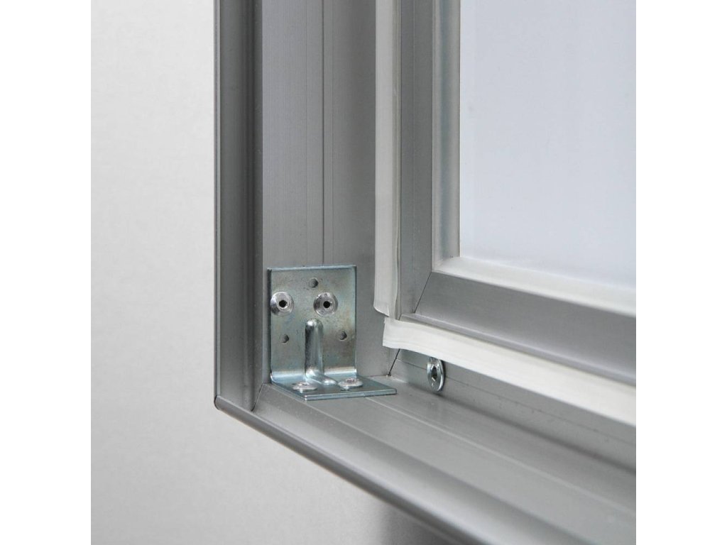 Venkovní robustní extra hluboká vitrína, velikosti 24xA4, se stříbrně eloxovaným rámem. Skleněná výplň čelních dveří je z bezpečnostního skla (4mm), čelní dveře jsou osazeny gumovým těsněním, což zajišťuje její voděodolnost. Venkovní vitrína má silné hliníkové profily a ocelovou lakovanou zadní stěnu, která je popisovatelná a magnetická. Snadnou manipulaci zajišťují horní panty dveří s plynovými otvíracími písty.