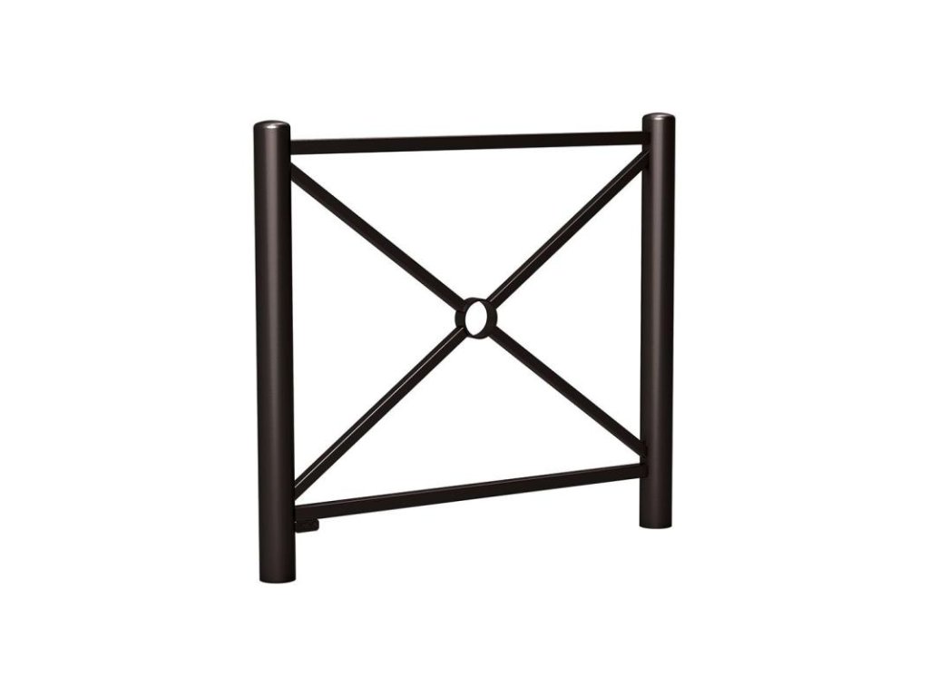 Zábradlí Carrefour o délce 1072 mm v černé barvě RAL 9005 s jednoduchou hlavicí a výplní ve tvaru klasického kříže nabízí elegantní vzhled, odolnou ocelovou konstrukci s kvalitní povrchovou úpravou a dlouhou životnost pro veřejné prostory.