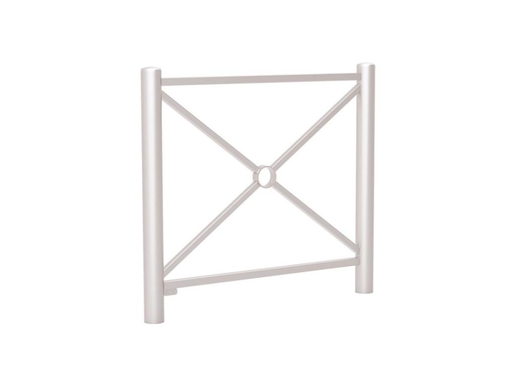 Zábradlí Carrefour o délce 1072 mm v šedé barvě RAL 7044 s jednoduchou hlavicí a výplní ve tvaru klasického kříže nabízí elegantní vzhled, odolnou ocelovou konstrukci s kvalitní povrchovou úpravou a dlouhou životnost pro veřejné prostory.
