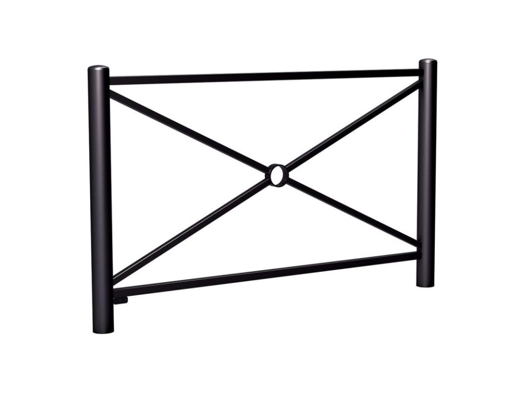 Zábradlí Carrefour o délce 1572 mm v černé barvě RAL 9005 s jednoduchou hlavicí a výplní ve tvaru klasického kříže nabízí elegantní vzhled, odolnou ocelovou konstrukci s kvalitní povrchovou úpravou a dlouhou životnost pro veřejné prostory.