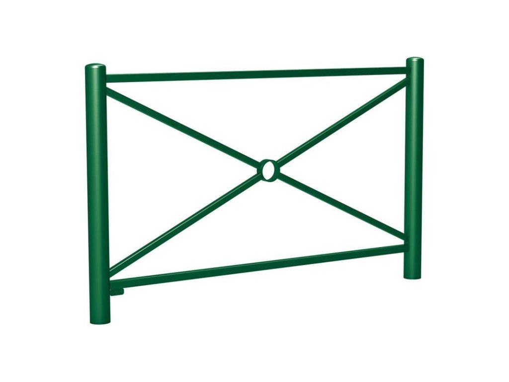 Zábradlí Carrefour o délce 1572 mm v zelené barvě RAL6005 s jednoduchou hlavicí a výplní ve tvaru klasického kříže nabízí elegantní vzhled, odolnou ocelovou konstrukci s kvalitní povrchovou úpravou a dlouhou životnost pro veřejné prostory.