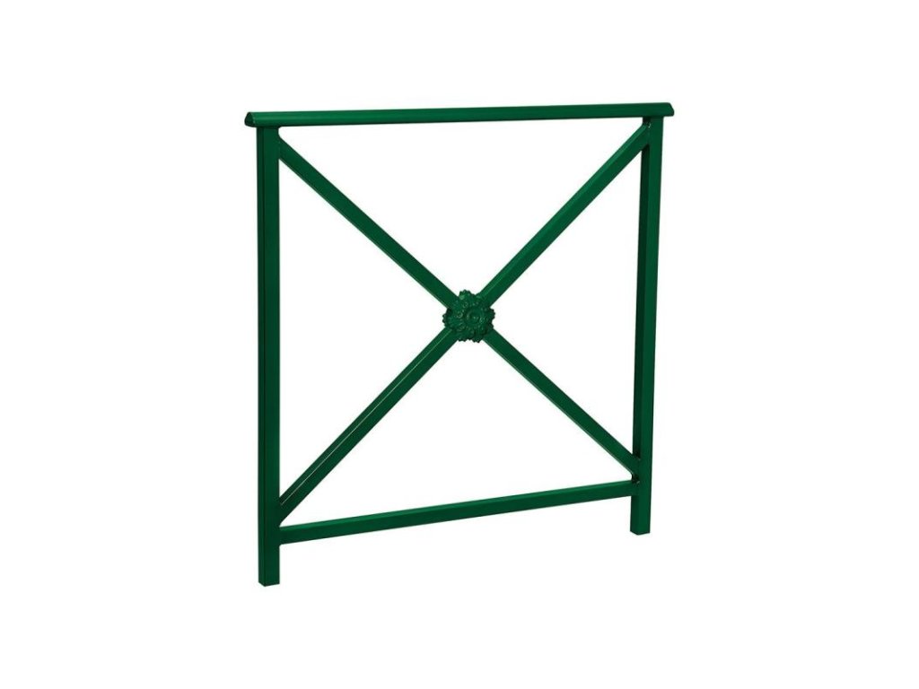 Zábradlí Lisabon 1000 mm v provedení zelená RAL 6005 s výplní jednoduchý kříž s okrasnou růžicí představuje elegantní a odolné ocelové zábradlí v klasickém městském stylu. Vyniká vysokou pevností, dlouhou životností a čistým vzhledem, který se skvěle hodí pro veřejné i reprezentační prostory.