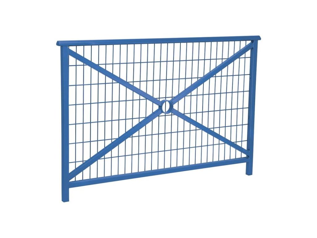 Zábradlí Lisabon 1500 mm v provedení modrá RAL 5010 s výplní jednoduchý kříž s mříží je elegantní a odolné ocelové zábradlí v klasickém městském stylu. Vyznačuje se vysokou pevností, dlouhou životností a čistým vzhledem, který se výborně hodí pro veřejné prostory i reprezentativní objekty.