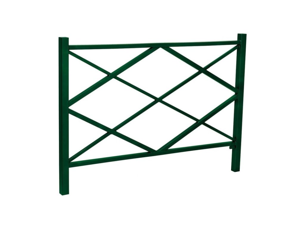 Tradiční zábradlí Losange o délce 1500 mm v elegantní zelené barvě RAL6005. Robustní ocelová konstrukce s úhlopříčnými výplněmi poskytuje pevnost a bezpečnost, možnost odnímatelnosti pak zaručuje flexibilní využití v městském prostředí.