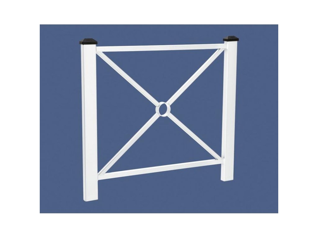 Zábradlí Pagode 1080 mm v bílé barvě RAL 9010 s výplní v podobě jednoduchého kříže nabízí pevnou ocelovou konstrukci a čistý, funkční design. Je vhodné pro veřejné i komerční prostory, kde spolehlivě vymezuje a chrání prostor.