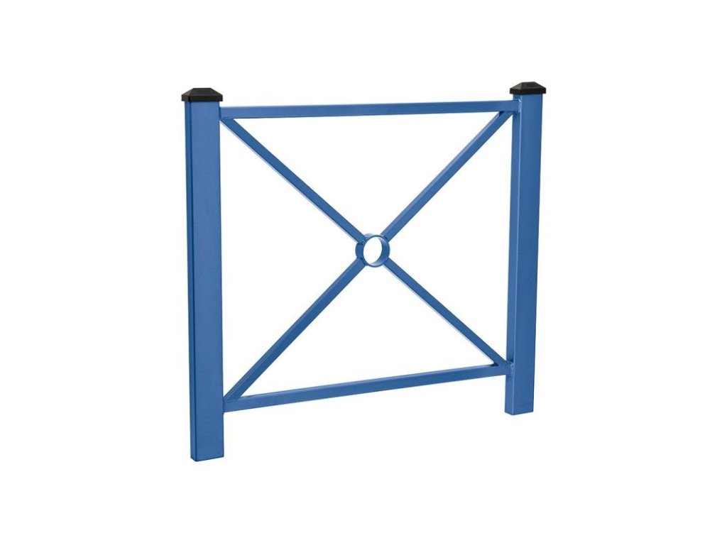 Zábradlí Pagode 1080 mm v modré barvě RAL 5010 s výplní v podobě jednoduchého kříže nabízí pevnou ocelovou konstrukci a čistý, funkční design. Je vhodné pro veřejné i komerční prostory, kde spolehlivě vymezuje a chrání prostor.
