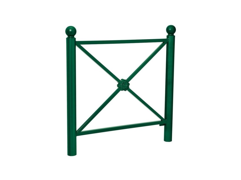 Zábradlí Province v zelené barvě RAL 6005 o délce 1072 mm s hlavicí Boule a výplní typu jednoduchý kříž s okrasnou růžicí. Robustní ocelová konstrukce s kvalitní povrchovou úpravou zajišťuje dlouhou životnost, vysokou odolnost vůči povětrnostním vlivům a esteticky jednotný vzhled ve veřejném prostoru.