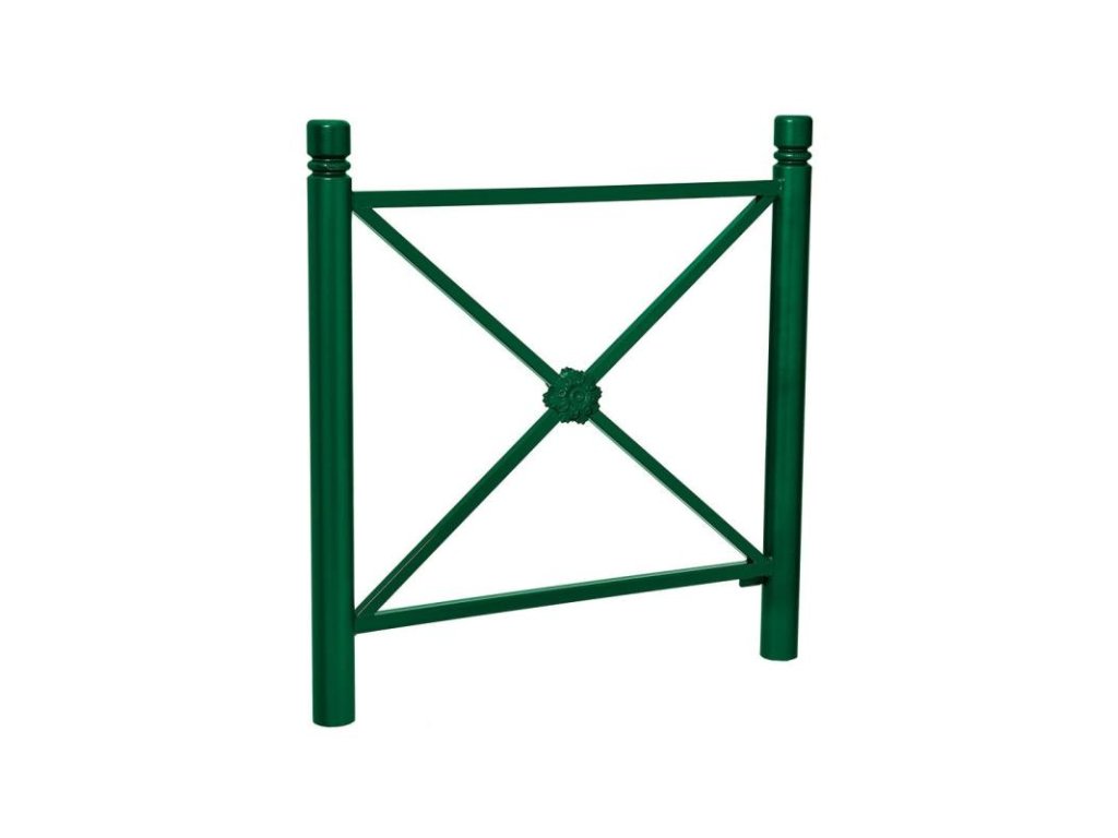 Zábradlí Province v zelené barvě RAL 6005, délky 1072 mm, s hlavicí City a výplní typu jednoduchý kříž s okrasnou růžicí. Pevná ocelová konstrukce s kvalitní povrchovou úpravou zaručuje dlouhou životnost, odolnost vůči povětrnostním vlivům a esteticky jednotný vzhled ve veřejném prostoru.