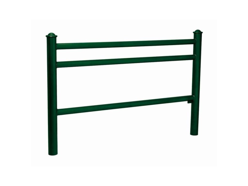 Zábradlí Trio Agora o délce 1572 mm v zelené barvě RAL 6005 kombinuje moderní design s funkčností. Elegantní hlavice Agora a tři horizontální příčky vytvářejí lehký, harmonický prvek vhodný pro městské prostory i pěší zóny.