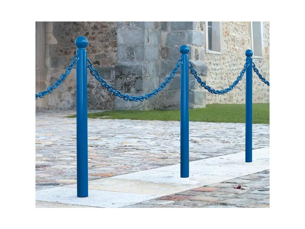 Ocelový zahrazovací sloupek Ø 114 mm, designová řada Province s litinovou hlavicí Boule. Sloupek je opatřen dvěma oky pro průběžné napojení řetězů.