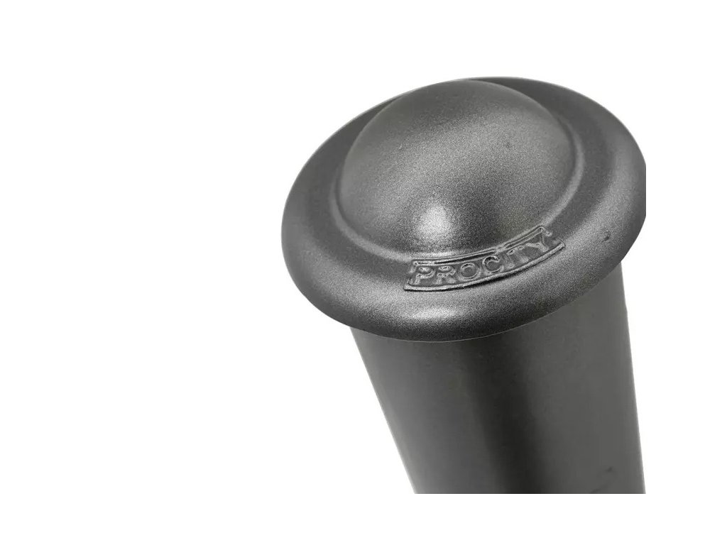 Ocelový zahrazovací sloupek Ø 114 mm řady Province s hlavicí Agora, určený pro řetězovou zábranu. Koncový sloupek s jedním okem. Barevné provedení barva černá RAL9005 na žárové zinkování.