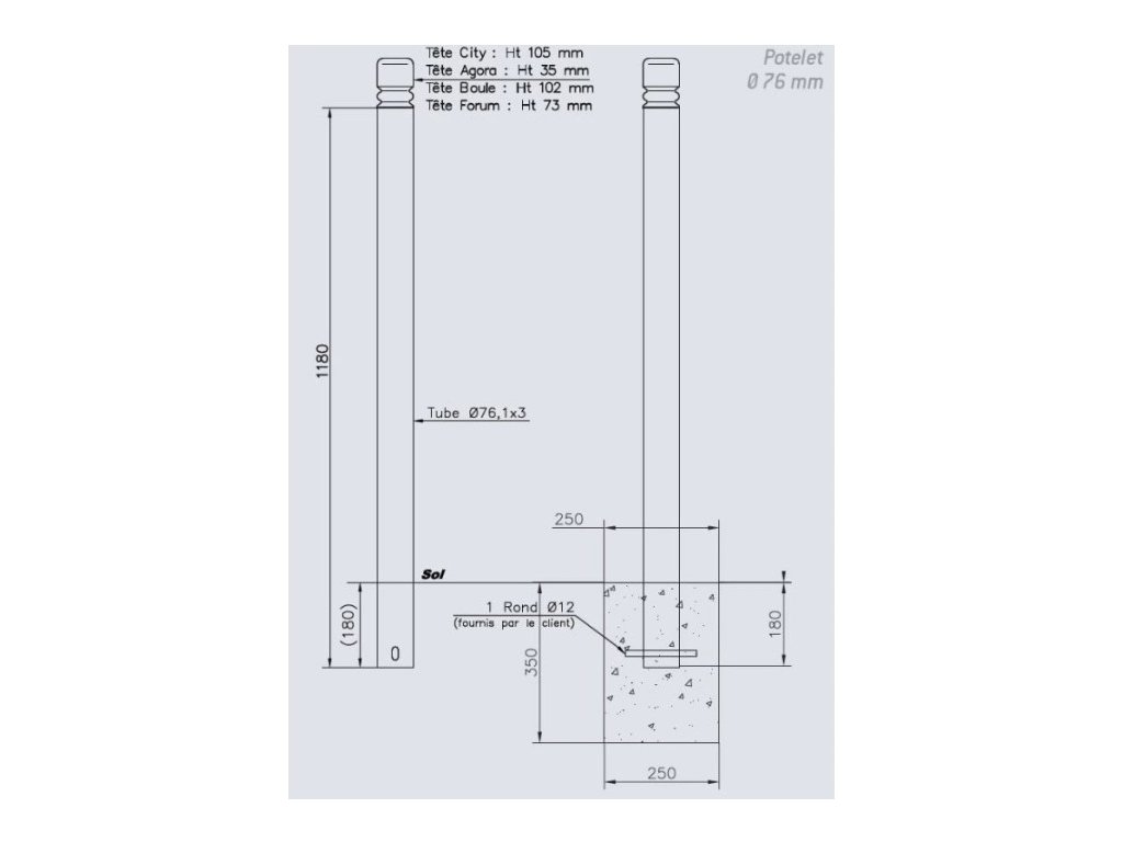 Ocelový zahrazovací sloupek Ø 76 mm řady Province s hlavicí Boule, určený pro řetězovou zábranu. Průběžný sloupek se dvěma oky. Barevné provedení barva šedá Procity na žárové zinkování.