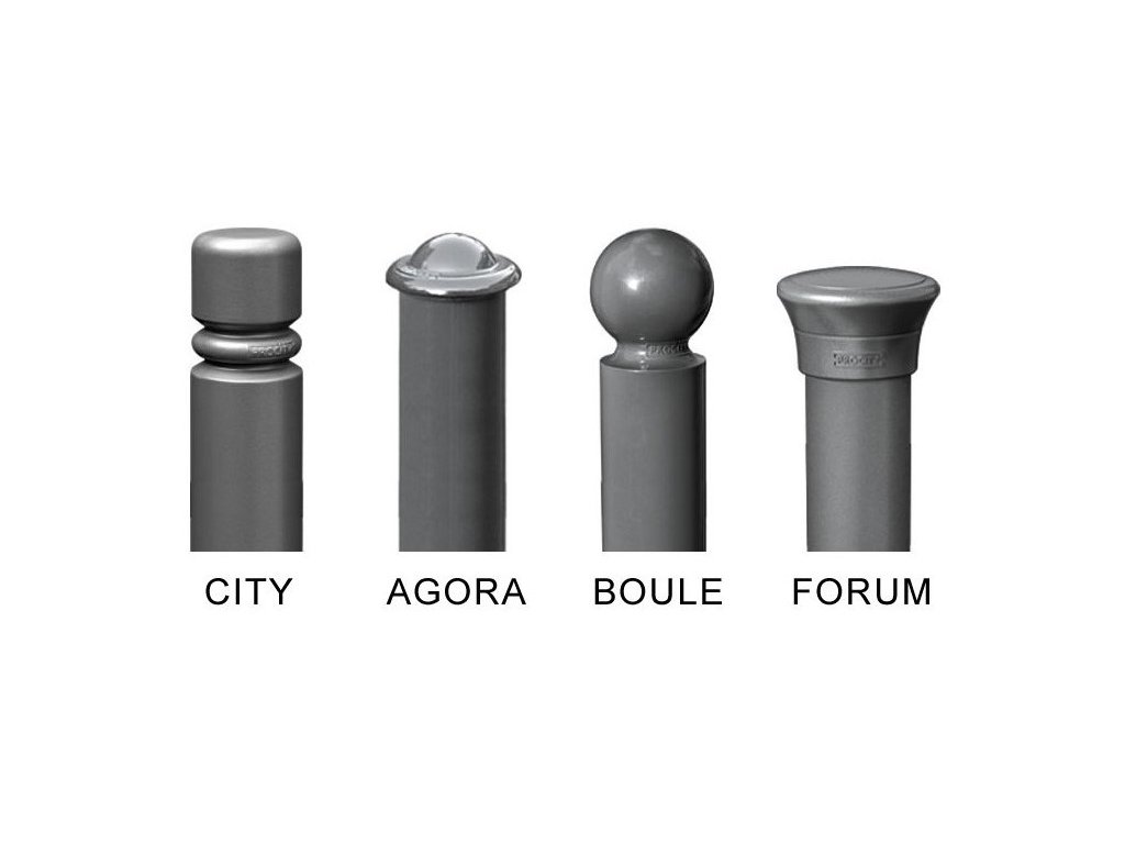 Ocelový zahrazovací sloupek Ø 76 mm, designová řada Province s litinovou hlavicí Boule. Sloupek je opatřen dvěma oky pro průběžné napojení řetězů.